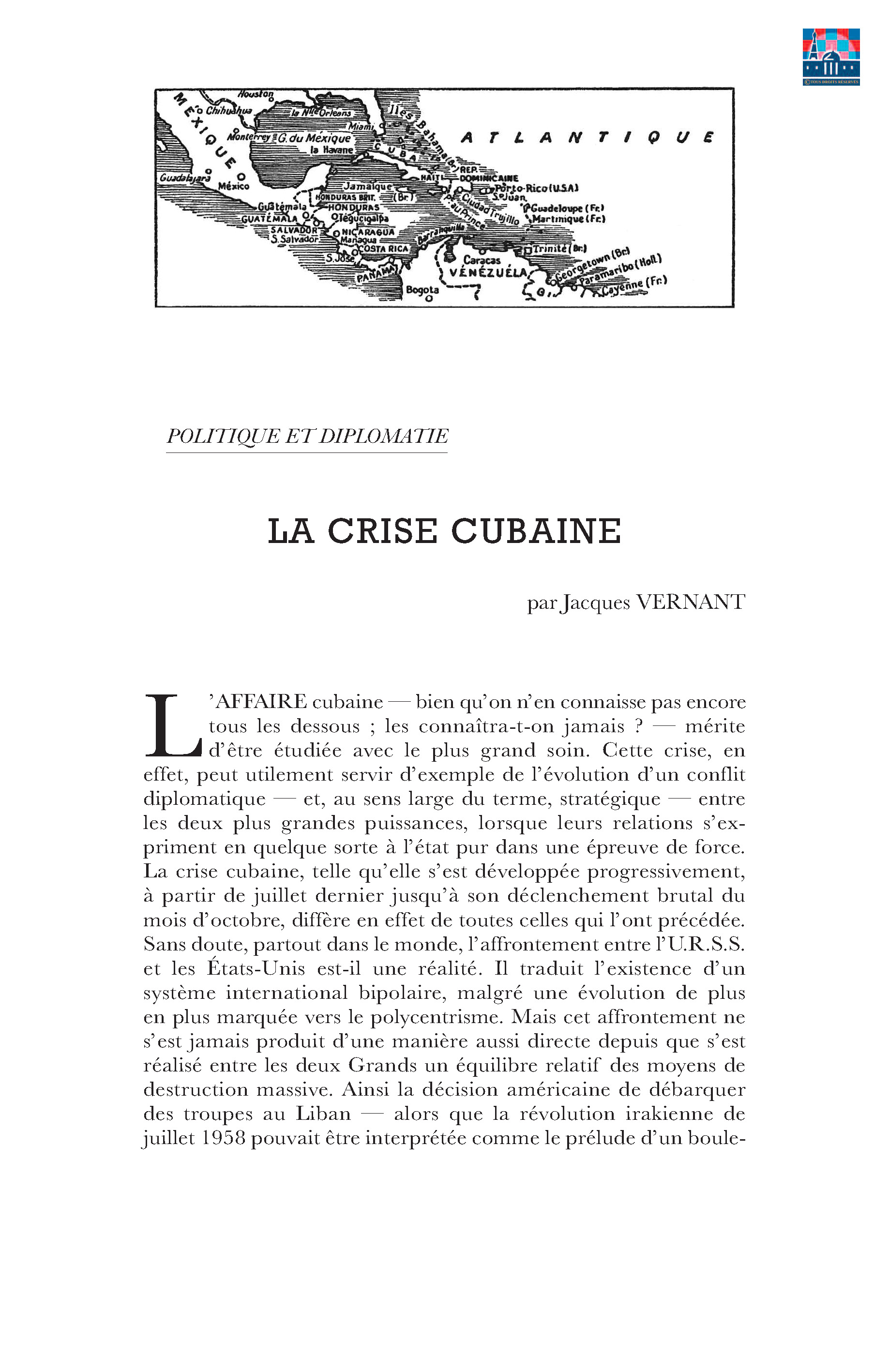 La crise de Cuba est une suite d'événements survenus entre le 14 et le 28 octobre 1962 qui ont opposé les États-Unis et l'Union soviétique au sujet des missiles nucléaires soviétiques pointés sur le territoire des États-Unis depuis l'île de Cuba, qui ont mené les deux Grands au bord de la guerre nucléaire. Quelles conclusions, quelles leçons peut-on tirer de ce cas-type d’affrontement direct ?