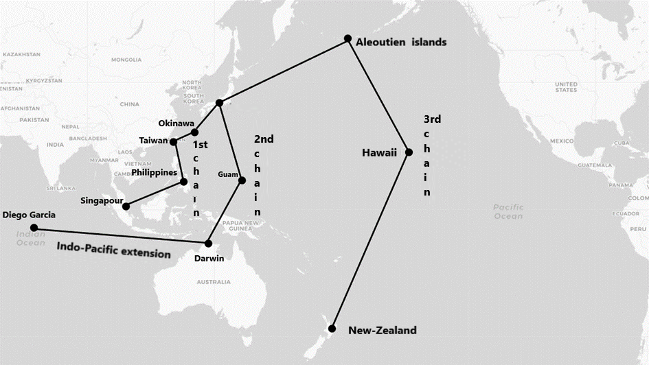 The United States has long been a power in the Indo-Pacific region. From the 19th century, the federal government developed a high-seas capability and extended its influence to the whole of the Pacific Basin—to Japan in 1853, Midway in1867 and the Philippines, Hawaii and Micronesia in 1898. Even before the United States entered the Second World War in 1941, the US Navy was a blue-water force, capable of being projected anywhere on the high seas. During the Cold War, the Secretary of State John Foster Dulles envisaged the containment of communist forces by a system of three arcs of circles—the island chain strategy—off the coastline of Eastern Asia. Washington still has sovereignty over eleven US territories in the Pacific Ocean(3) and through the Compact of Free Association has links with the Republic of Palau, the Federated States of Micronesia and the Republic of the Marshall Islands.