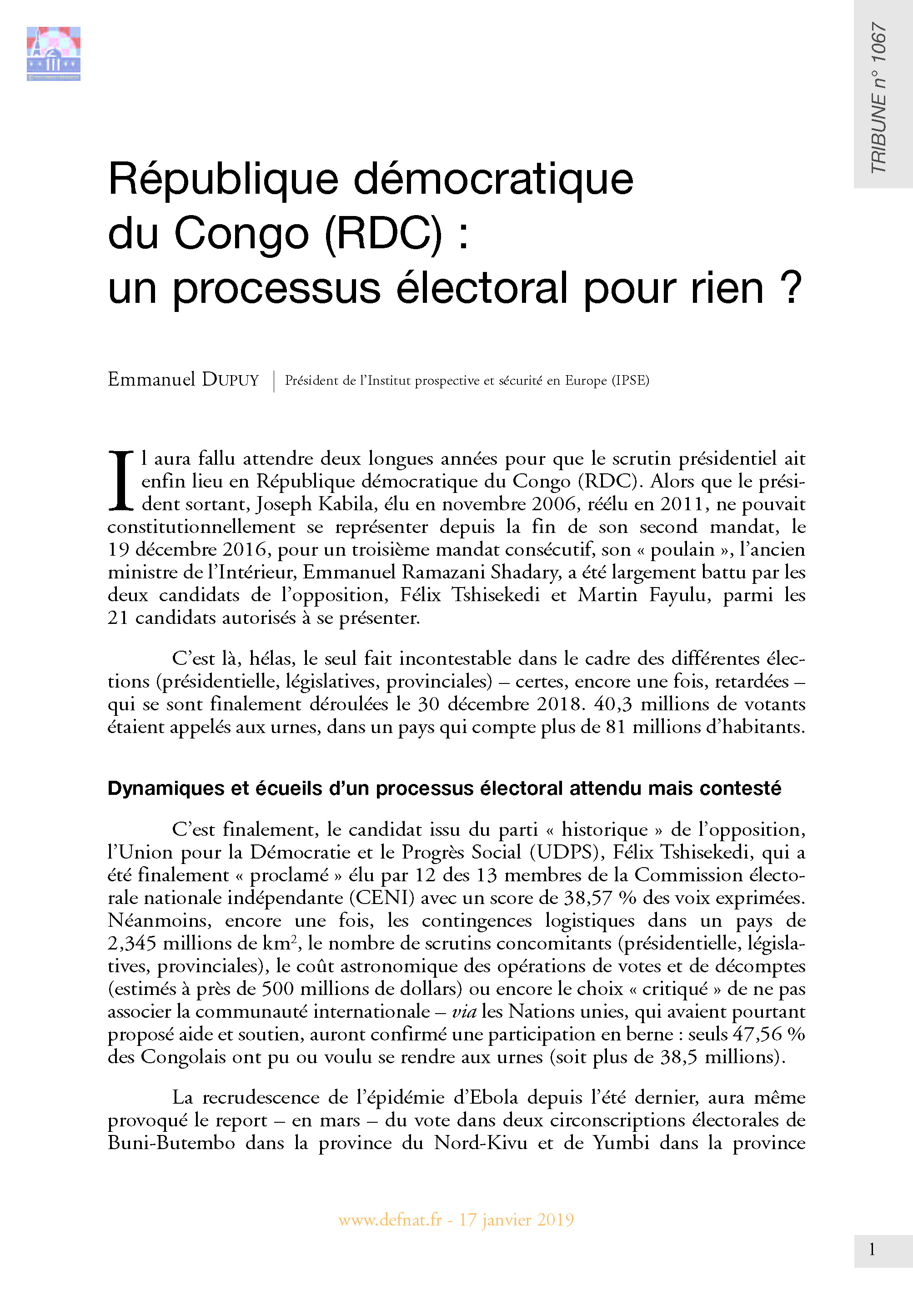 Le processus électoral en République démocratique du Congo (RDC) a été plus que compliqué en raison de nombreuses oppositions internes dont celle du Président sortant. Cela traduit la déstabilisation durable de cet État-continent au cœur du continent africain et qui est l’enjeu de convoitises par des acteurs avides de profiter des ressources naturelles de ce pays. C’est aussi un nouveau terrain de confrontation avec la Russie, de retour dans la région.