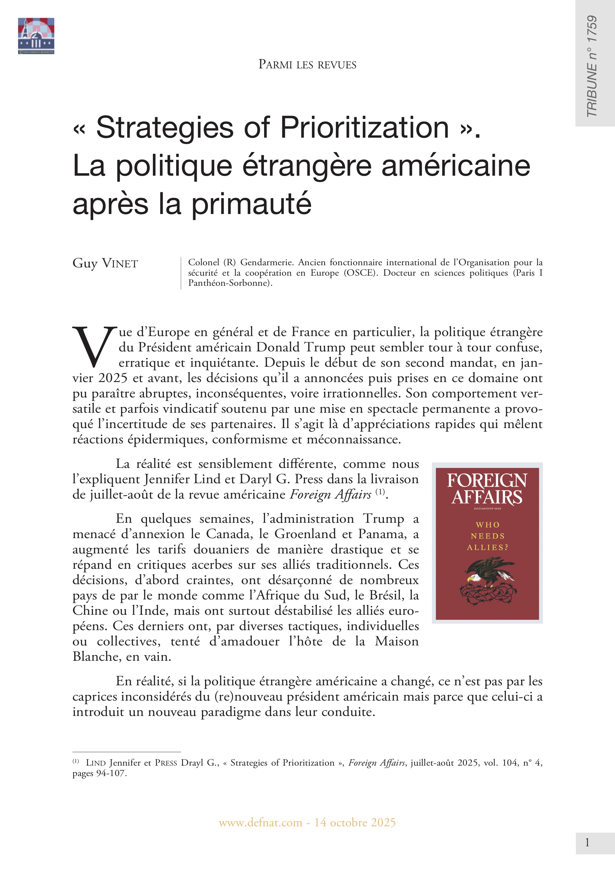 (1) Lind Jennifer et Press Drayl G., « Strategies of Prioritization », Foreign Affairs, juillet-août 2025, vol. 104, n° 4, pages 94-107.