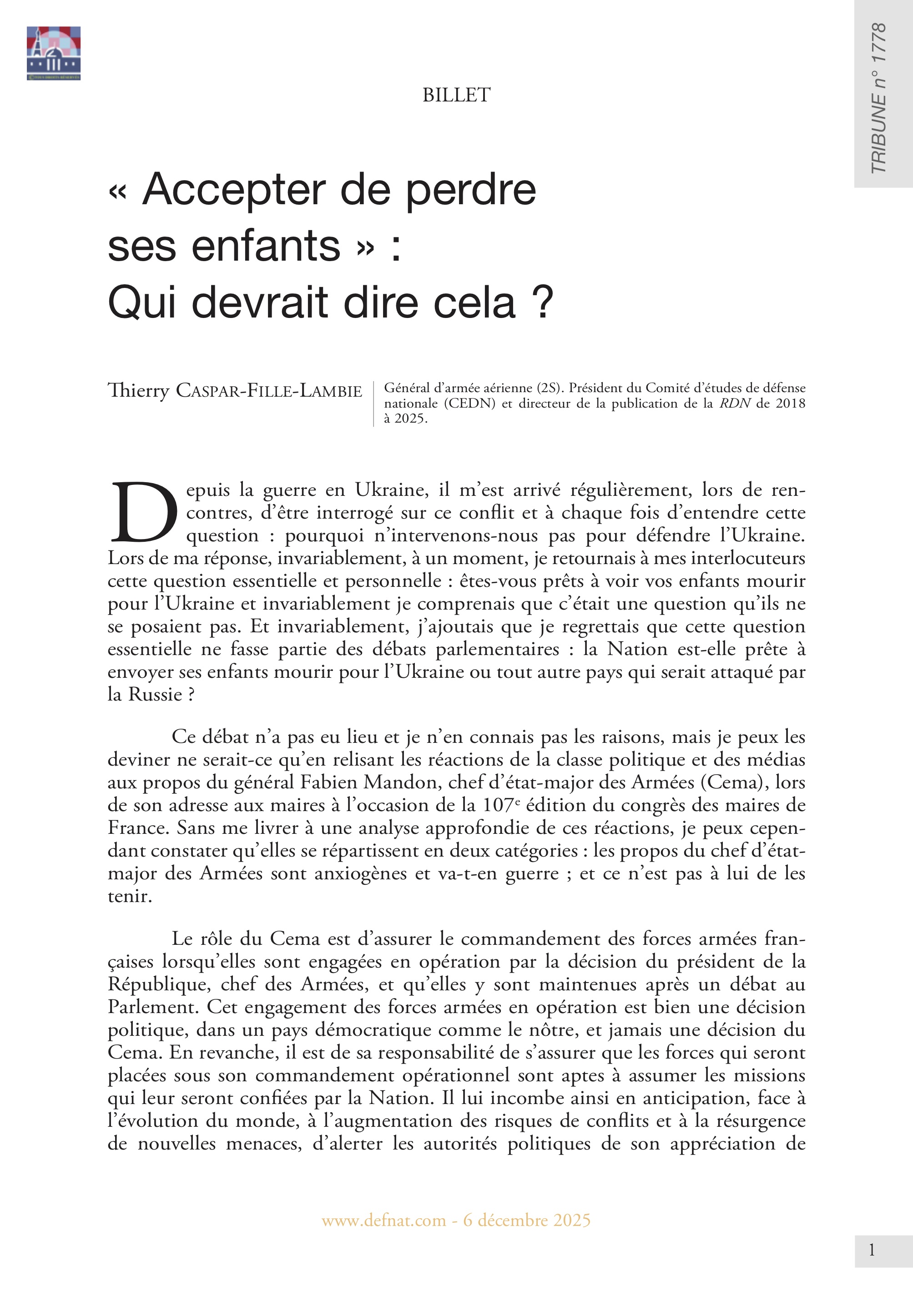 Le dernier à vouloir la guerre est le chef d’état-major des Armées, qu’il s’appelle Thierry Burkhard ou Fabien Mandon. Le premier disait qu’il fallait « gagner la guerre avant la guerre », le second qu’il faut montrer sa force pour dissuader la Russie de toute agression envers un des pays de l’alliance. Les responsables militaires œuvrent sans relâche à éviter que les conditions d’un affrontement soient réunies tout en tenant leurs forces prêtes à servir, s’il avait lieu. C’est dans cette perspective, que l’on ne peut occulter, que le général Mandon a prononcé cette phrase : « le pays doit être prêt à perdre ses enfants » dans le cas d’une confrontation avec la Russie. Être fort pour éviter l’affrontement implique d’être prêt à engager les forces armées, s’il le fallait, soutenues par une Nation soudée et solidaire. Une Nation faisant preuve de force morale.
