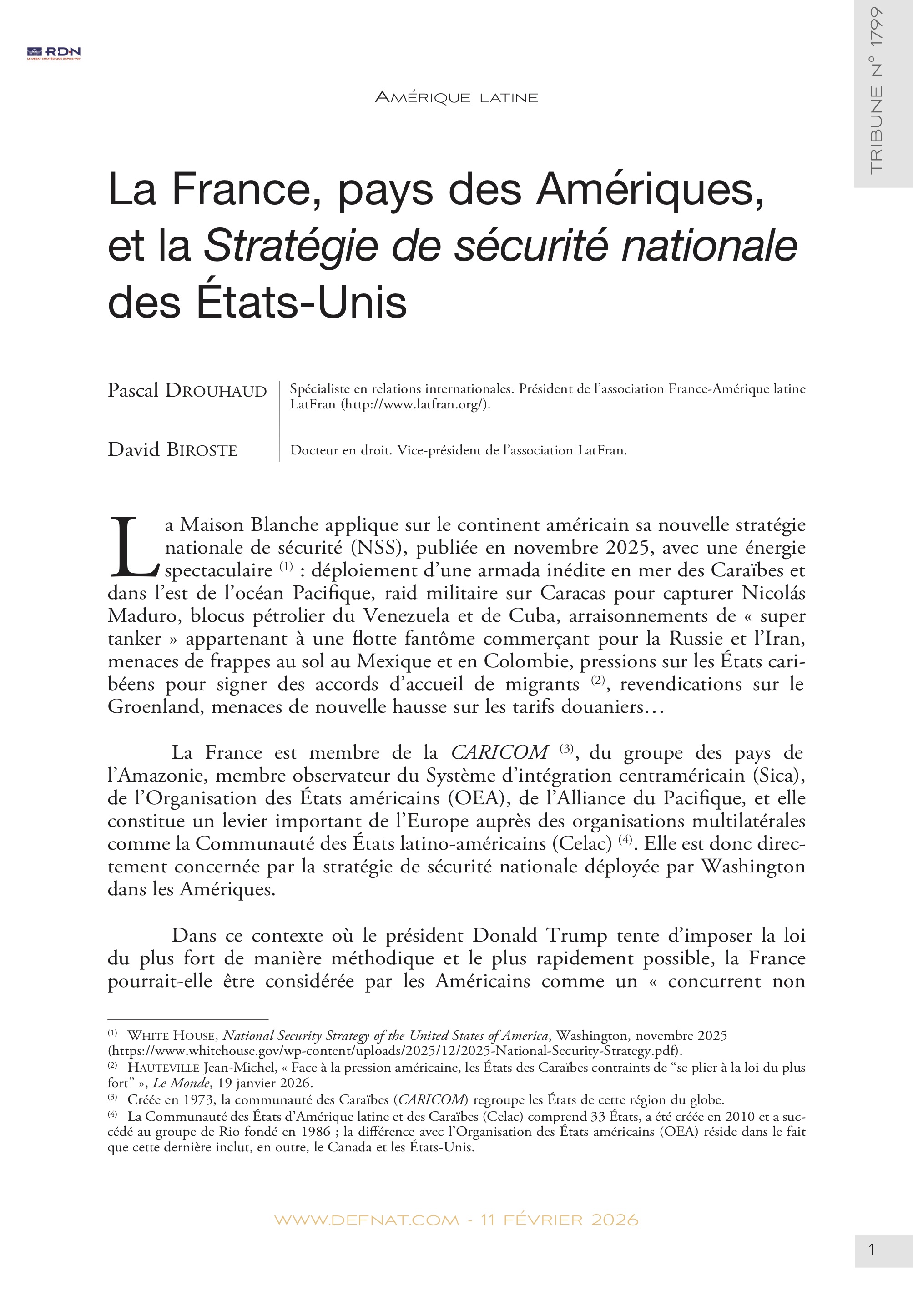 (18) Drouhaud Pascal et Biroste David, « L’après Maduro ou le retour de la politique impériale des États-Unis », RDN, tribune n° 1787, 12 janvier 2026 (https://www.defnat.com/e-RDN/vue-tribune.php?ctribune=1902).
