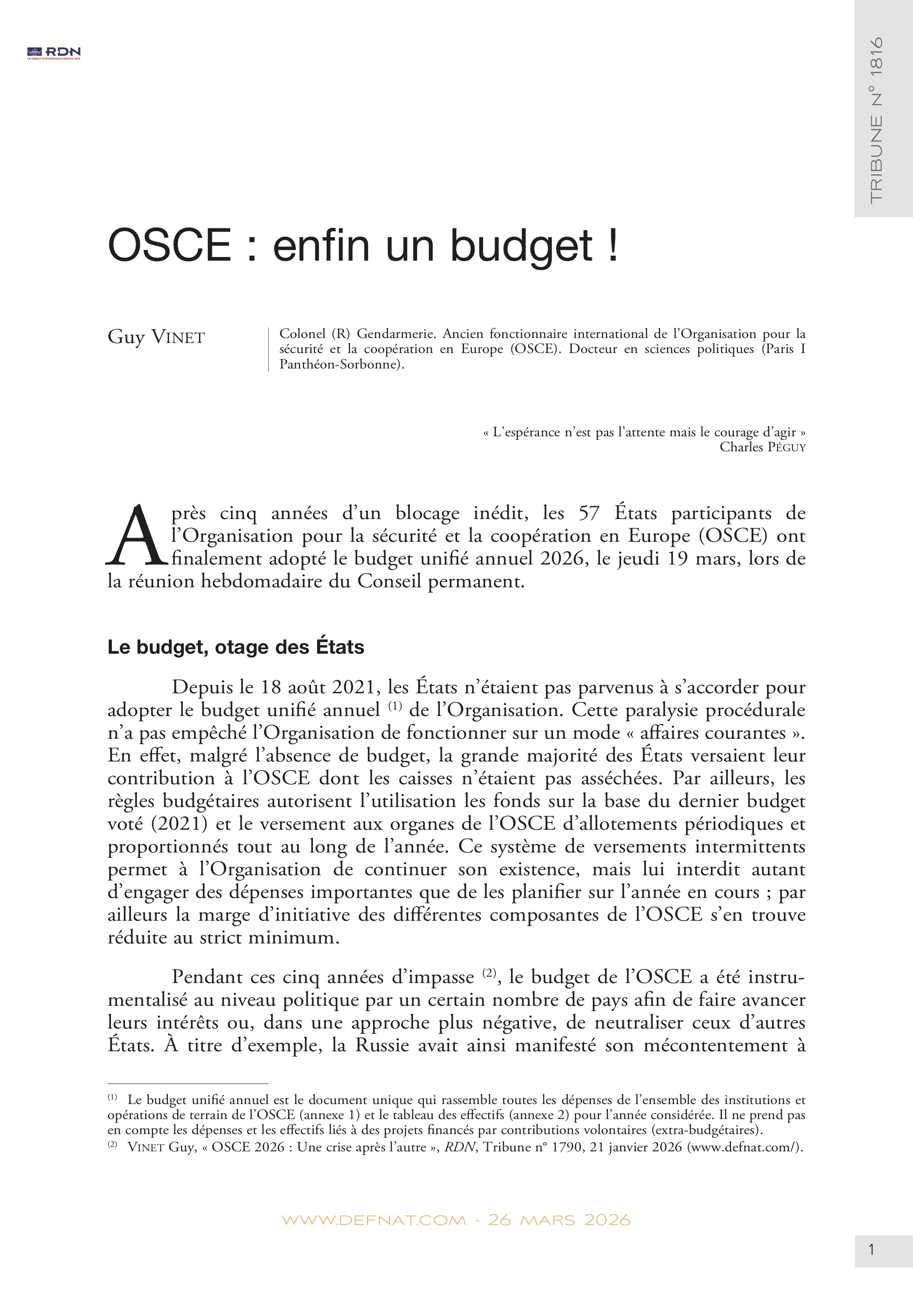 (2) Vinet Guy, « OSCE 2026 : Une crise après l’autre », RDN, Tribune n° 1790, 21 janvier 2026 (www.defnat.com/).