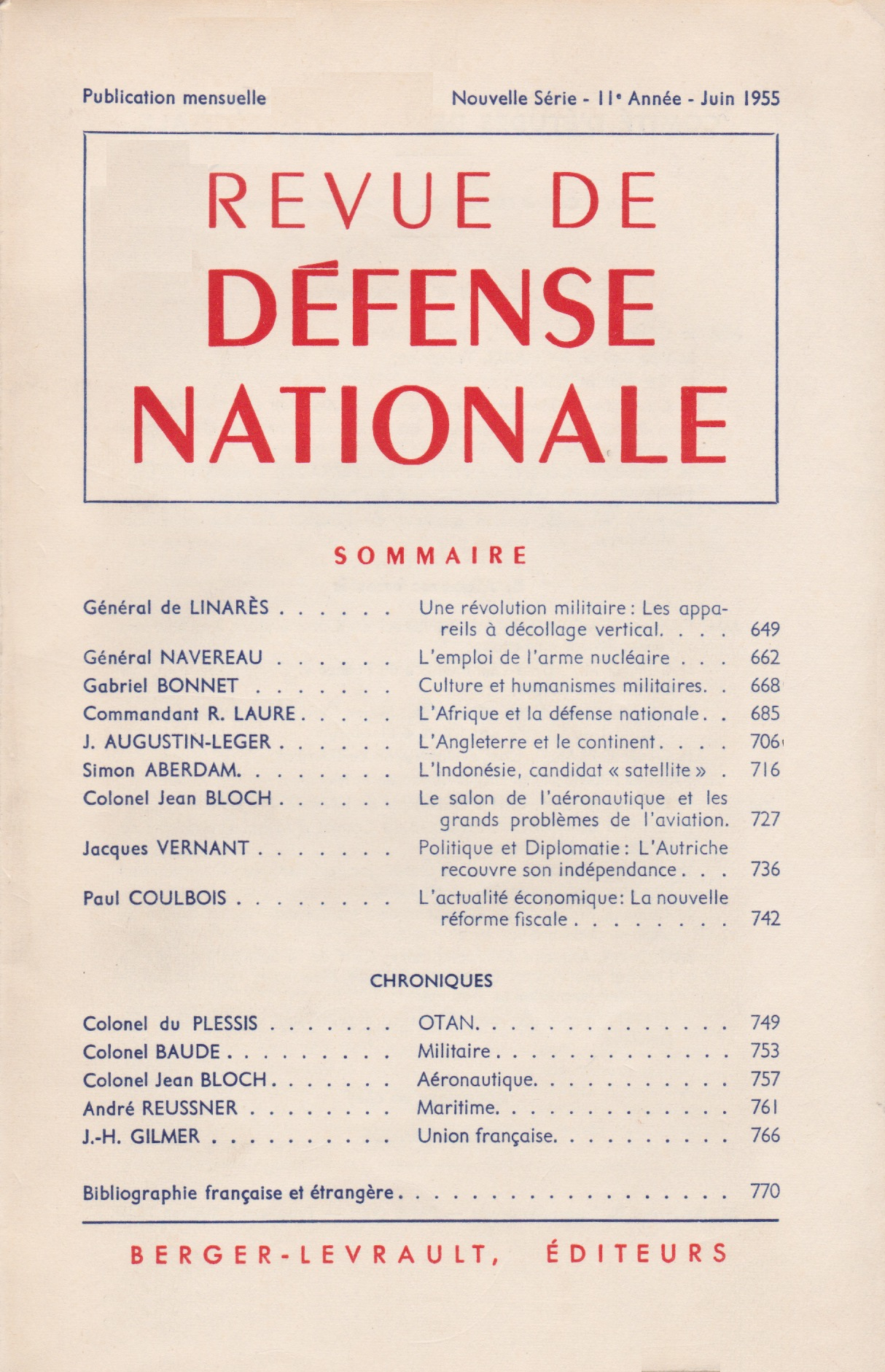 Avant de partir en Allemagne pour une tournée d’inspection, le 18 février 1955, l'auteur avait mis la dernière main à un article sur les appareils à décollage vertical. Cette étude que le général (décédé à l'hôpital de Baden-Baden le 2 mars) réservait à la RDN représente le terme d’une évolution de sa pensée sur les problèmes de la réorganisation de l’Armée et de la mise au point de nouvelles tactiques. Lire les premières lignes