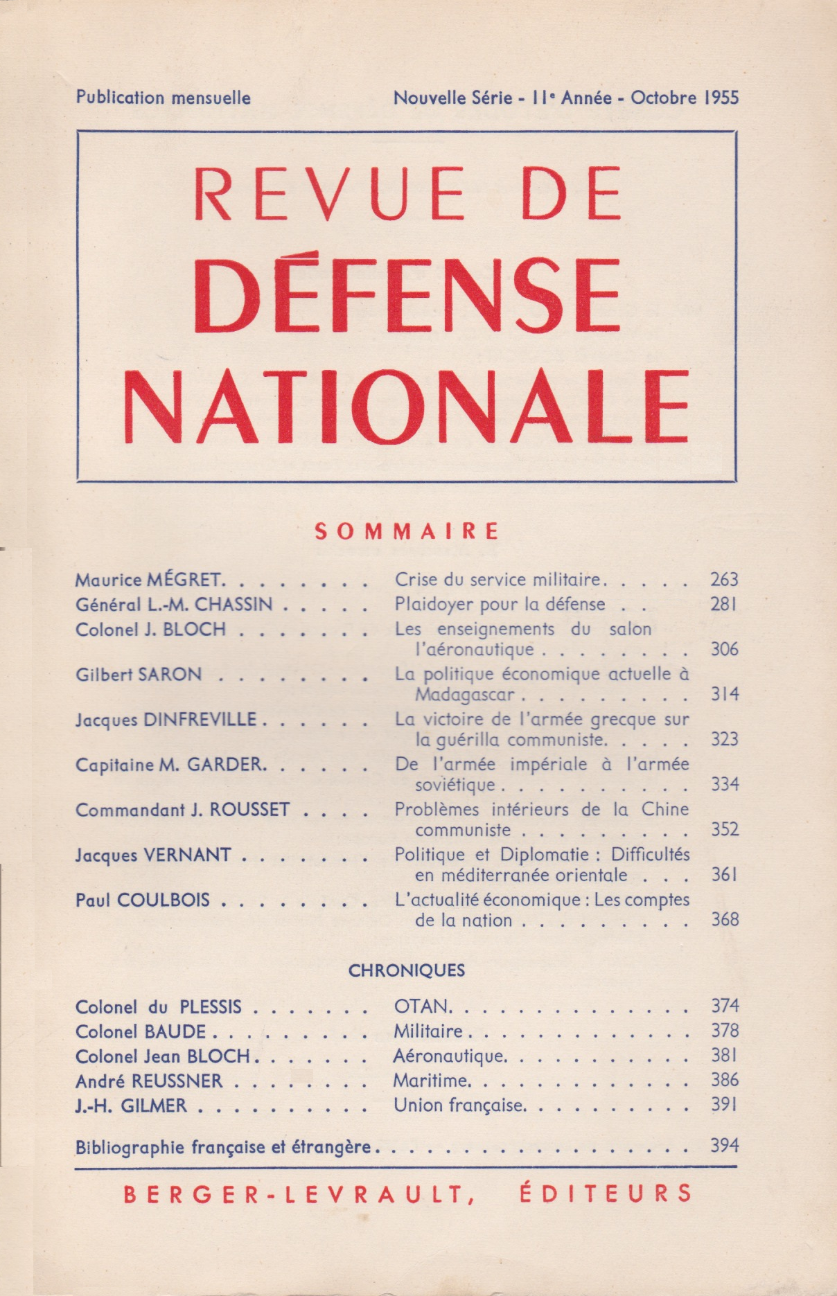 Dix ans après la Libération, l’établissement de la Charte de la Défense nationale et la refonte de nos Forces armées divisent encore les experts. Cette indécision n’est pas sans danger : sans doute ne met-elle pas en péril la sécurité immédiate du Pays qui, sur le Continent, dépend davantage du système atlantique de défense intégrée que de la solution de ces querelles d’école, mais, à terme, elle constitue une menace pour le moral même d’une nation dont les responsabilités et les enjeux, dans l’Union Française, débordent largement le cadre atlantique. Lire les premières lignes