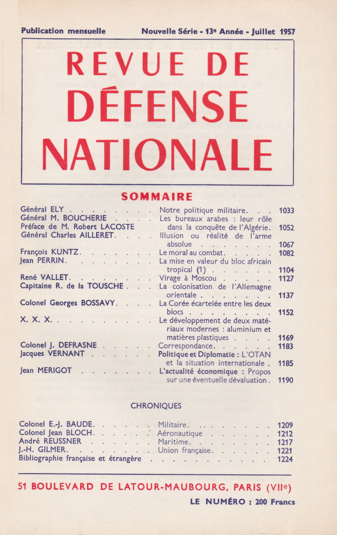 Dans la conjoncture mouvante où nous nous trouvons, marquée par l’incertitude des rapports internationaux, nos difficultés outre-mer, la révolution dans les techniques, il importe plus que jamais d’avoir une politique militaire cohérente et à long terme, faute de quoi tous nos efforts seraient à la fois vains et trop coûteux. Lire les premières lignes