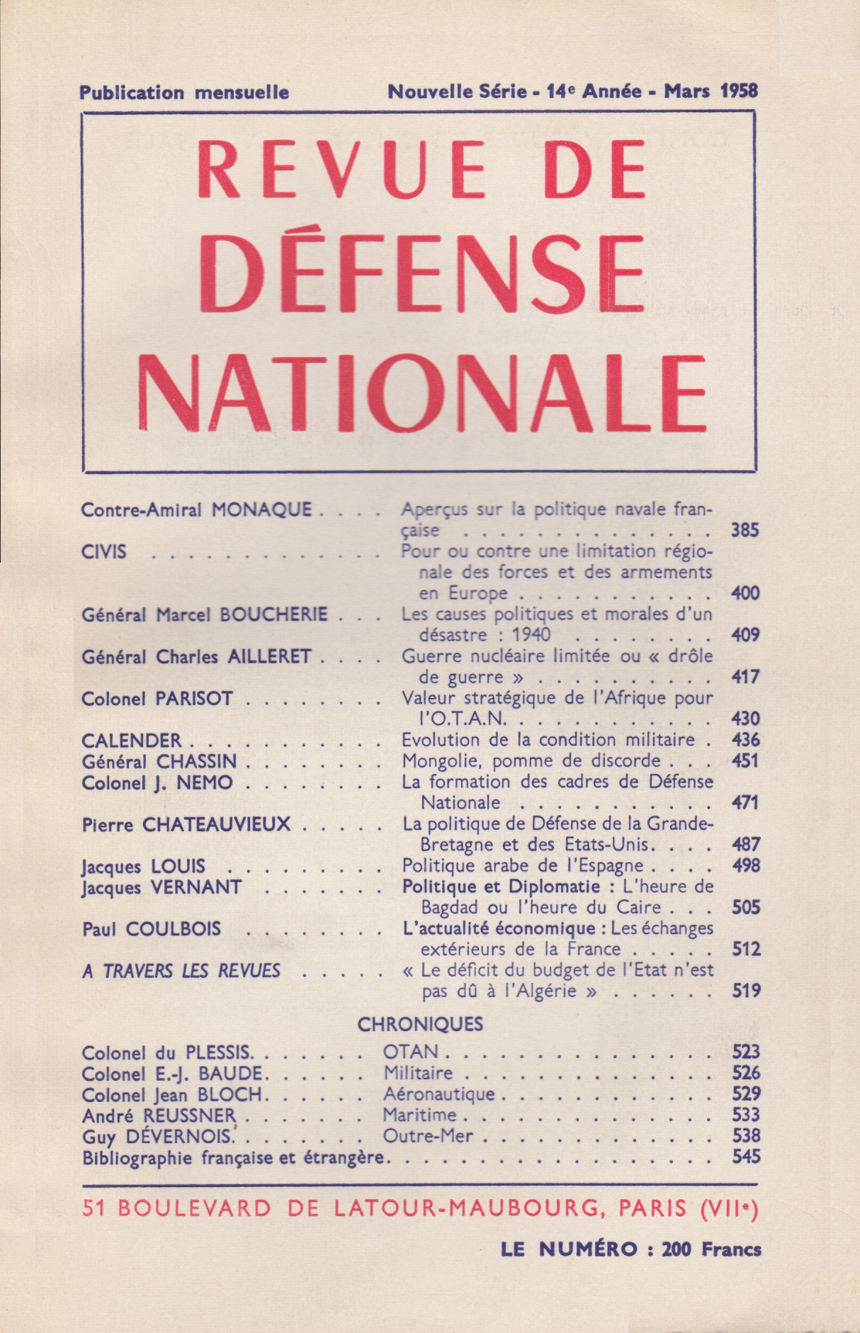 Traiter de politique navale est toujours hasardeux puisque c’est, pour une bonne part, anticiper sur l’avenir ; en traiter au lendemain des premiers lancements d’engins intercontinentaux et de satellites artificiels serait outrecuidant si l’on prétendait tracer un programme précis basé sur une doctrine assurée ; notre propos est heureusement plus modeste ; après avoir défini ce que nous entendons par « politique navale » et en avoir rappelé l’évolution au cours de ces dernières années, nous nous bornerons à indiquer les tâches qui incombent aux Forces Maritimes dans le cadre de notre politique militaire générale, à évoquer les principaux problèmes que leur exécution pose à l’heure actuelle et enfin à jeter un rapide coup d’œil sur les moyens qui, « demain » et « après-demain » devraient nous permettre de résoudre ces problèmes. Lire les premières lignes