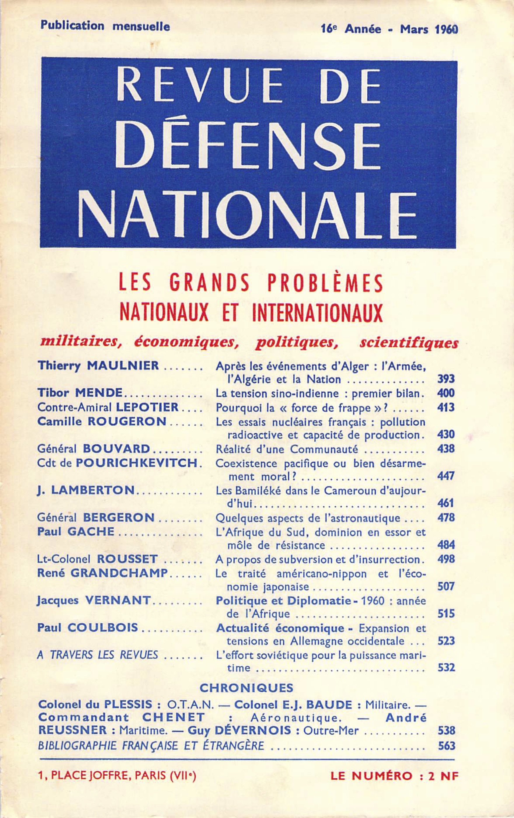 Dans son message de fin d’année, le général d’armée aérienne Jouhaud, Chef d’état-major de l’Armée de l’air, a déclaré : « Dans le cadre de la Communauté, l’Armée de l’air s’est vue confier la charge de participer à la défense extérieure des États-membres. Cette mission est à sa mesure, grâce à la mobilité stratégique qui est sa caractéristique propre et qu’elle a manifesté ces derniers mois ». Lire les premières lignes