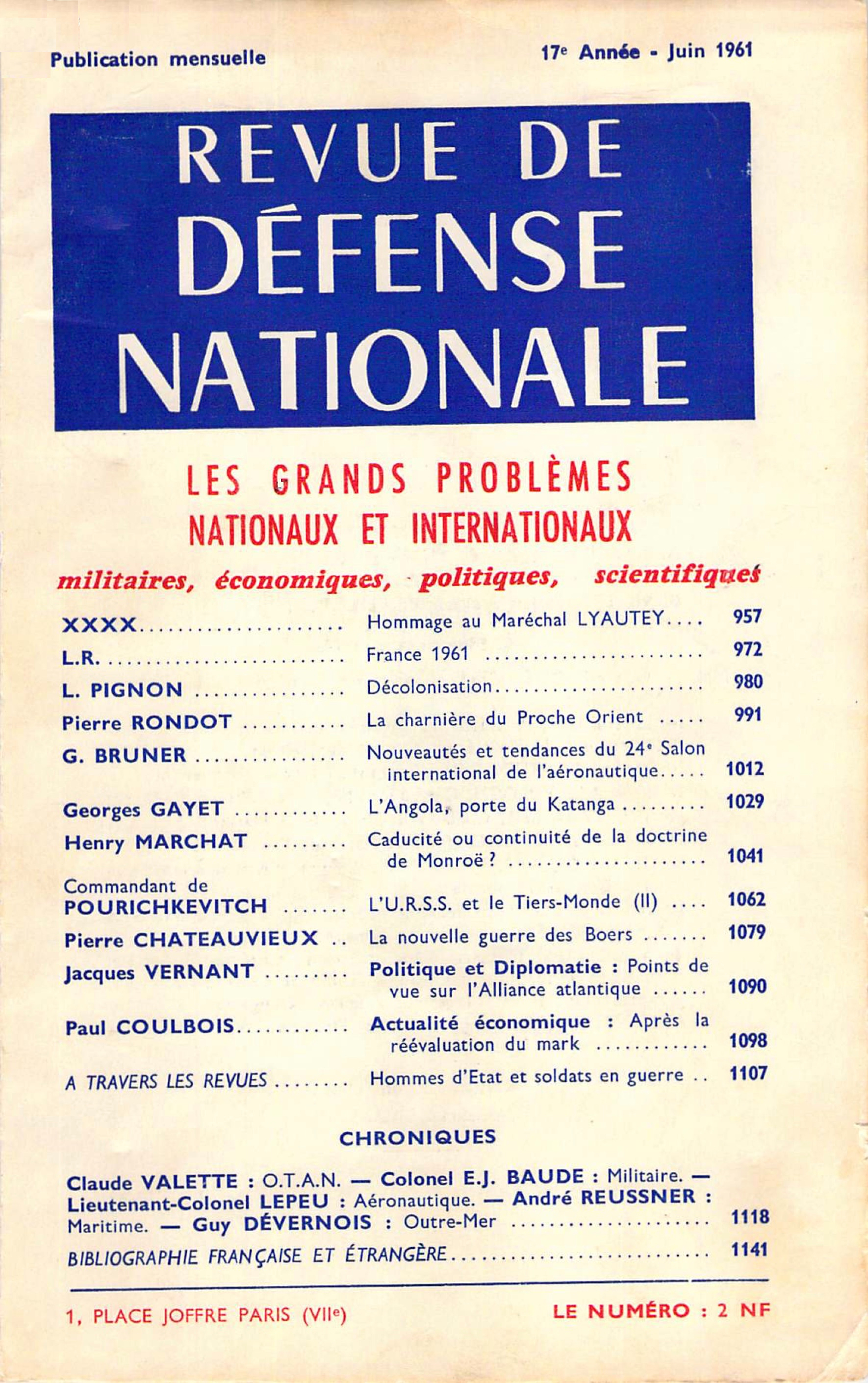 La Revue a publié, dans son numéro de novembre 1960, le chapitre liminaire de ce livre, dans lequel les problèmes de défense sont posés en termes clairs, dans leur totalité et leur complexité. Il est donc inutile de procéder ici à un exposé détaillé des idées de l’auteur. Il semble plus indiqué, dans l’intérêt des lecteurs qui n’auraient pas encore lu le livre, de montrer sous quelle forme et dans quelle mesure le général Valluy a développé les premières données. Lire la suite