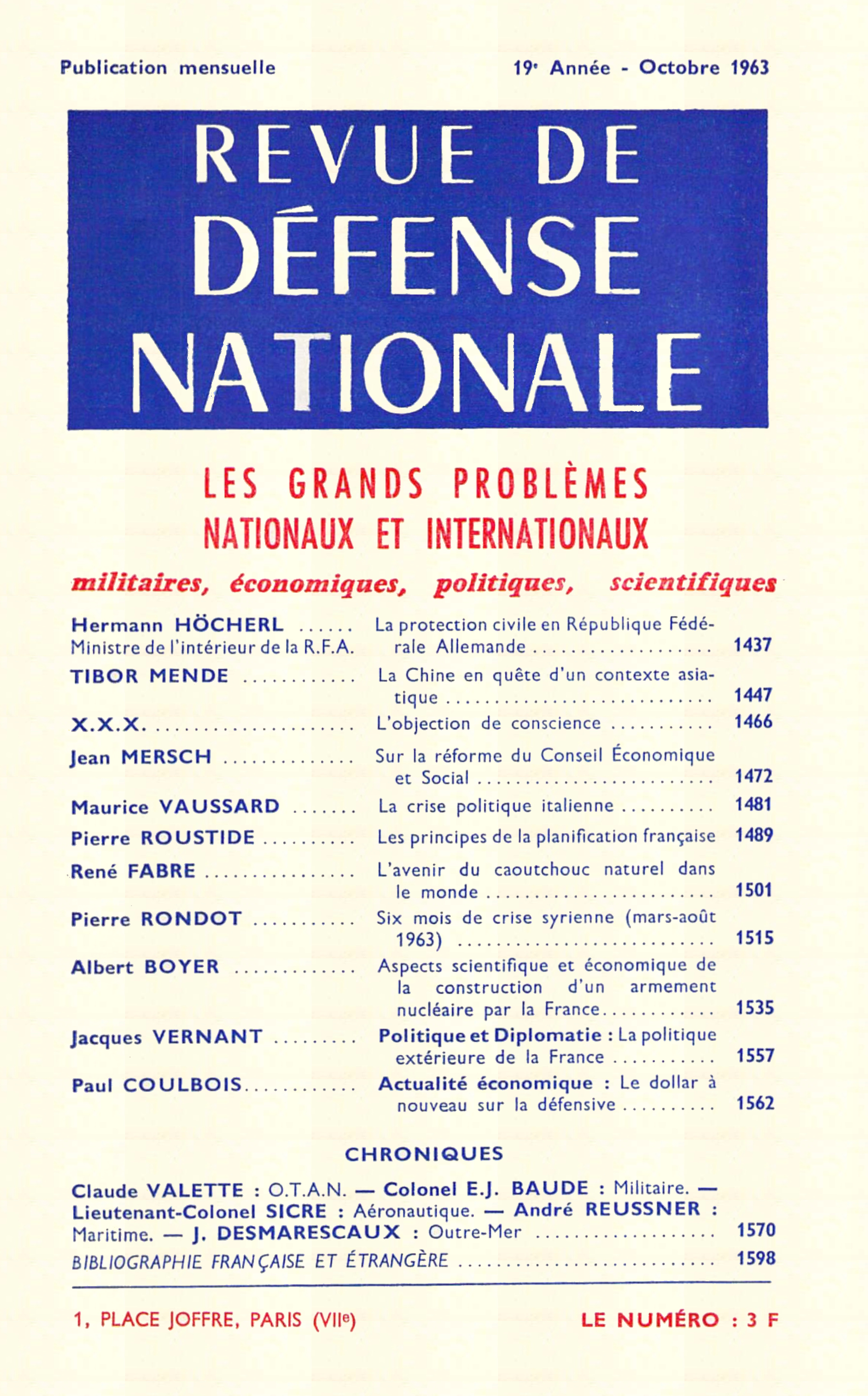 Dans notre livraison de juillet 1963, André Letourneux a confronté les deux pôles extrêmes de la défense : la dissuasion et la survie. Dans sa conclusion, il affirmait que : « la défense reposera toujours, pour une très grande part, sur l’endurance des citoyens ». En juin 1962, le colonel du Lattay exposait la conception et l’organisation américaines en matière de défense, et, à cette occasion, les réalisations en cours dans quelques États. Aujourd’hui, le ministre de l’Intérieur de l’Allemagne fédérale nous présente les récentes mesures décidées par le gouvernement allemand pour protéger la population civile et sauvegarder la vie publique. Ainsi, dans tous les pays apparaît – depuis relativement peu de temps, il est vrai – ce souci majeur « d’aider la vie à se maintenir », si par malheur l’épreuve leur était imposée. Lire les premières lignes