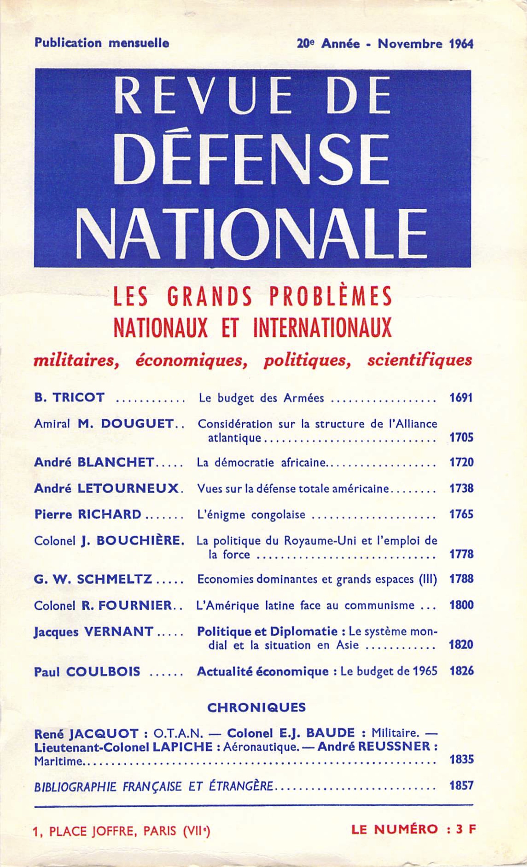 Conférence prononcée au Collège de l'Otan le 10 juin 1964. Le Collège de Défense de l’Otan, dont la création revient à l’initiative du général Eisenhower, a été inauguré le 19 novembre 1951. Un des bâtiments de l’École militaire à Paris lui est affecté. Il a pour tâche de former des officiers supérieurs et des fonctionnaires des pays de l’Otan destinés à occuper des postes importants dans les organisations du Pacte Atlantique. Les cours comprennent une cinquantaine de stagiaires par promotion ; la durée des cours est d’environ six mois. Vingt-cinq promotions comprenant au total plus de douze cents élèves sont maintenant sorties du Collège où règne une atmosphère très cordiale ; cette institution s’est révélée un instrument de coopération atlantique tout à fait remarquable. Lire la suite