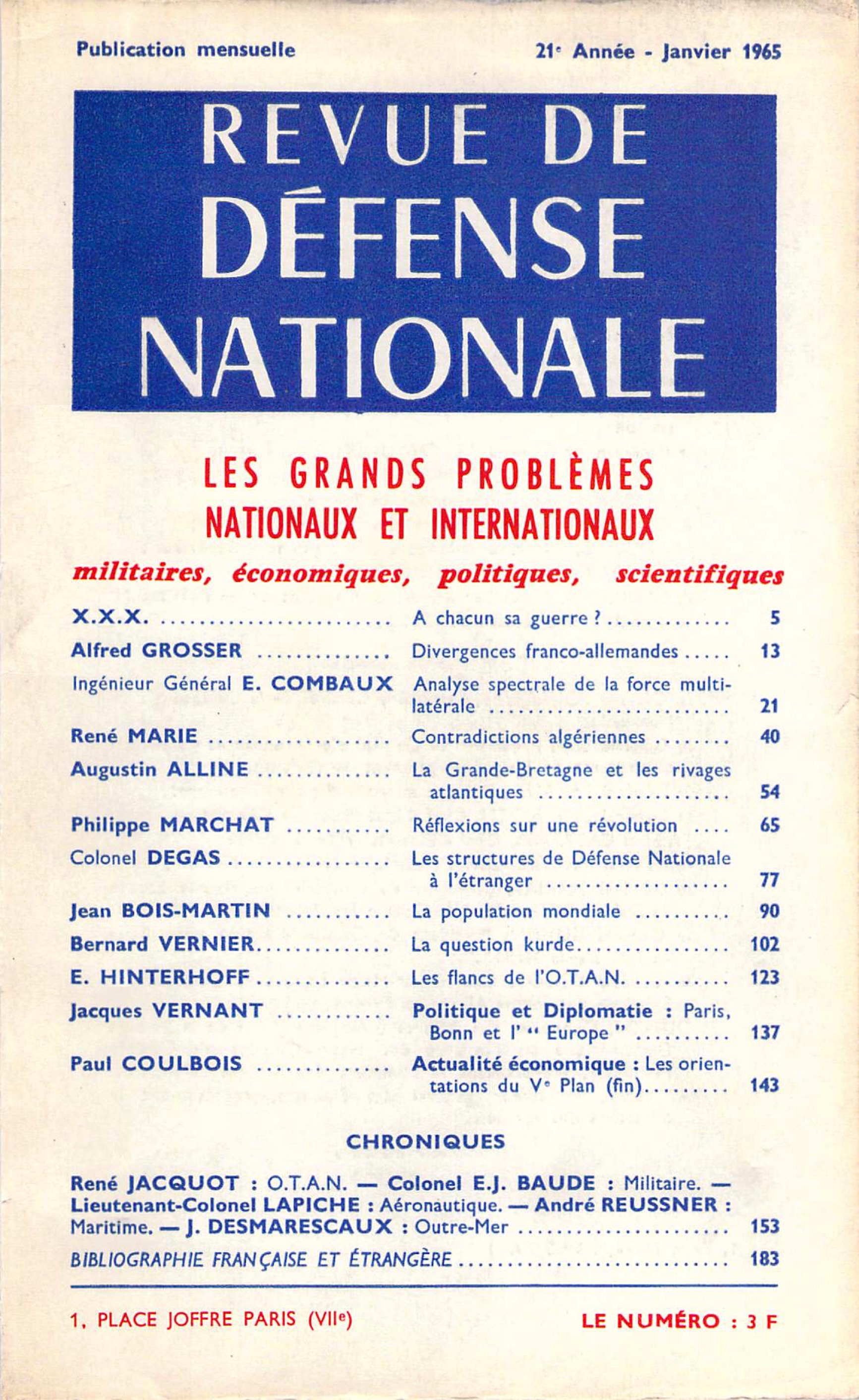 Le budget de 1965, adopté en première lecture par l’Assemblée nationale, mais profondément remanié par le Sénat (rejet, entre autres crédits, de ceux qui concernaient la force de dissuasion, le 18 novembre, par 156 voix contre 74), a été définitivement voté le 3 décembre, à l’Assemblée nationale par 284 voix contre 143, au Sénat par 130 voix contre 115 et 23 abstentions, après que, à l’exemple de l’an dernier, une commission mixte paritaire eût rétabli les crédits incriminés. Le projet de budget de la Marine, adopté en fin de compte sans modifications, ayant déjà été analysé et commenté dans une précédente chronique, nous n’y reviendrons pas. Toutefois, la seconde loi de programme, dont on avait craint un instant que la discussion ne fût reportée faute de temps à la session d’avril 1965, a été, elle aussi, votée à l’Assemblée nationale dans la nuit du 2 au 3 décembre, après deux jours de débats, par 278 voix contre 178 et 16 abstentions. Lire les premières lignes