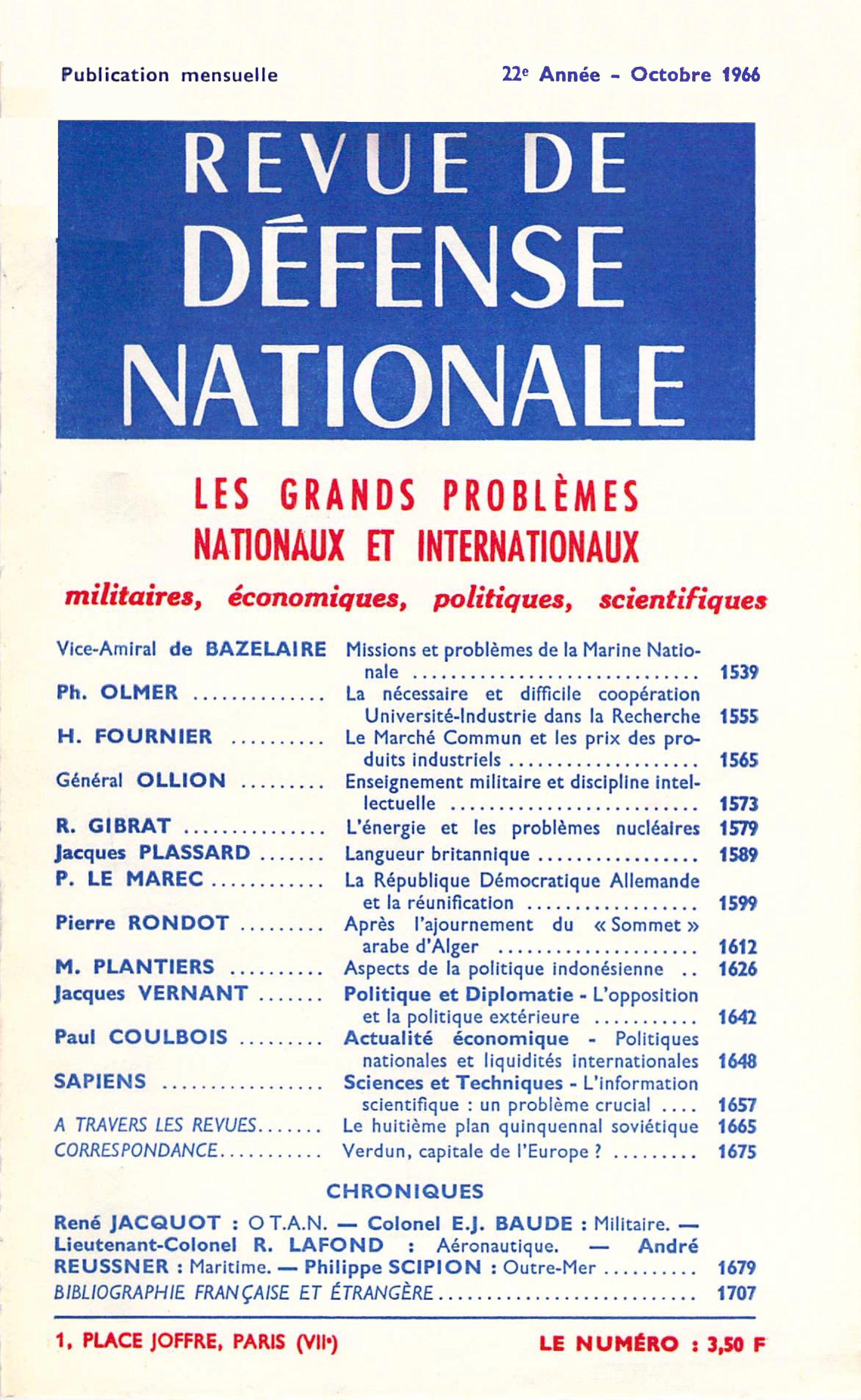 La récente publication du Livre Blanc britannique et les remous suscités dans la Royal Navy par les décisions du Gouvernement de M. Wilson ont souligné les difficultés que soulève l’adaptation de la structure d’une défense nationale moderne aux concepts stratégiques de notre temps et aux possibilités financières des pays. Dans cette période de mutation qu’impose l’utilisation militaire de l’atome, nos propres forces armées en sont également à chercher leur équilibre. La Marine en particulier se trouve confrontée avec de graves problèmes et les prochaines années seront décisives pour son orientation. L’exposé qui va suivre a pour objet de brosser un tableau aussi complet que possible de cette situation en faisant en premier lieu le point des missions et tâches qui incombent à la Marine, puis de récapituler les moyens dont elle dispose pour les remplir avant d’aborder les perspectives d’avenir. Lire les premières lignes