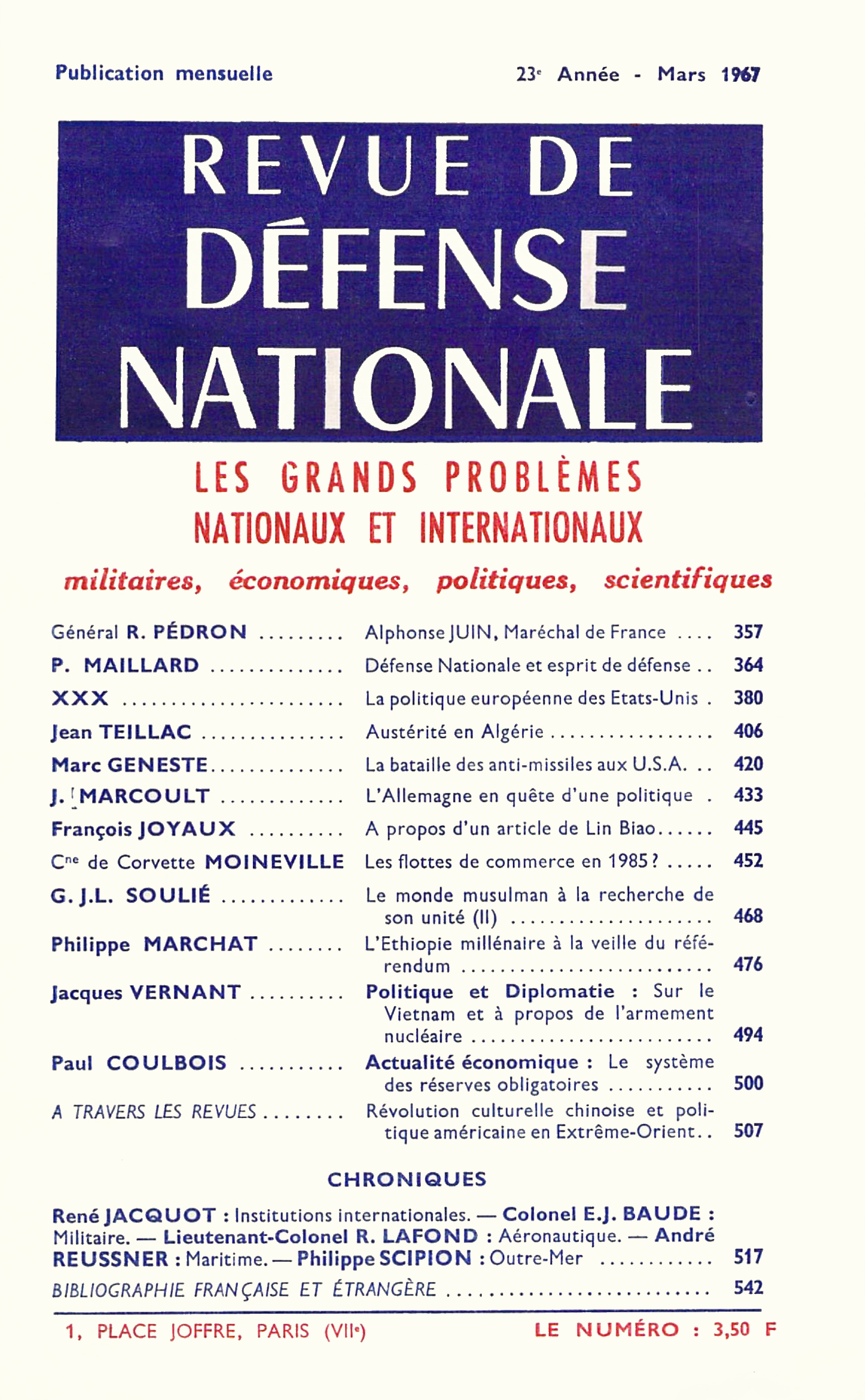 La RDN perd, en la personne du Maréchal Juin, le président de son Comité de patronage. Le Maréchal avait accepté cette fonction en 1954. Ancien Chef d’état-major général de la défense nationale, il était utilement intéressé par la présentation et la diffusion des grands problèmes qui, à des titres divers, intéressent la défense et sollicitent de ce fait le concours de toutes les activités du pays. Nous avons demandé au général Pédron, qui appartint à l’État-major du Corps expéditionnaire français (CEF) en Italie avant de devenir chef d’état-major du Maréchal Juin, de rappeler quelques traits de sa personnalité et certains actes de sa longue carrière militaire. Lire la suite