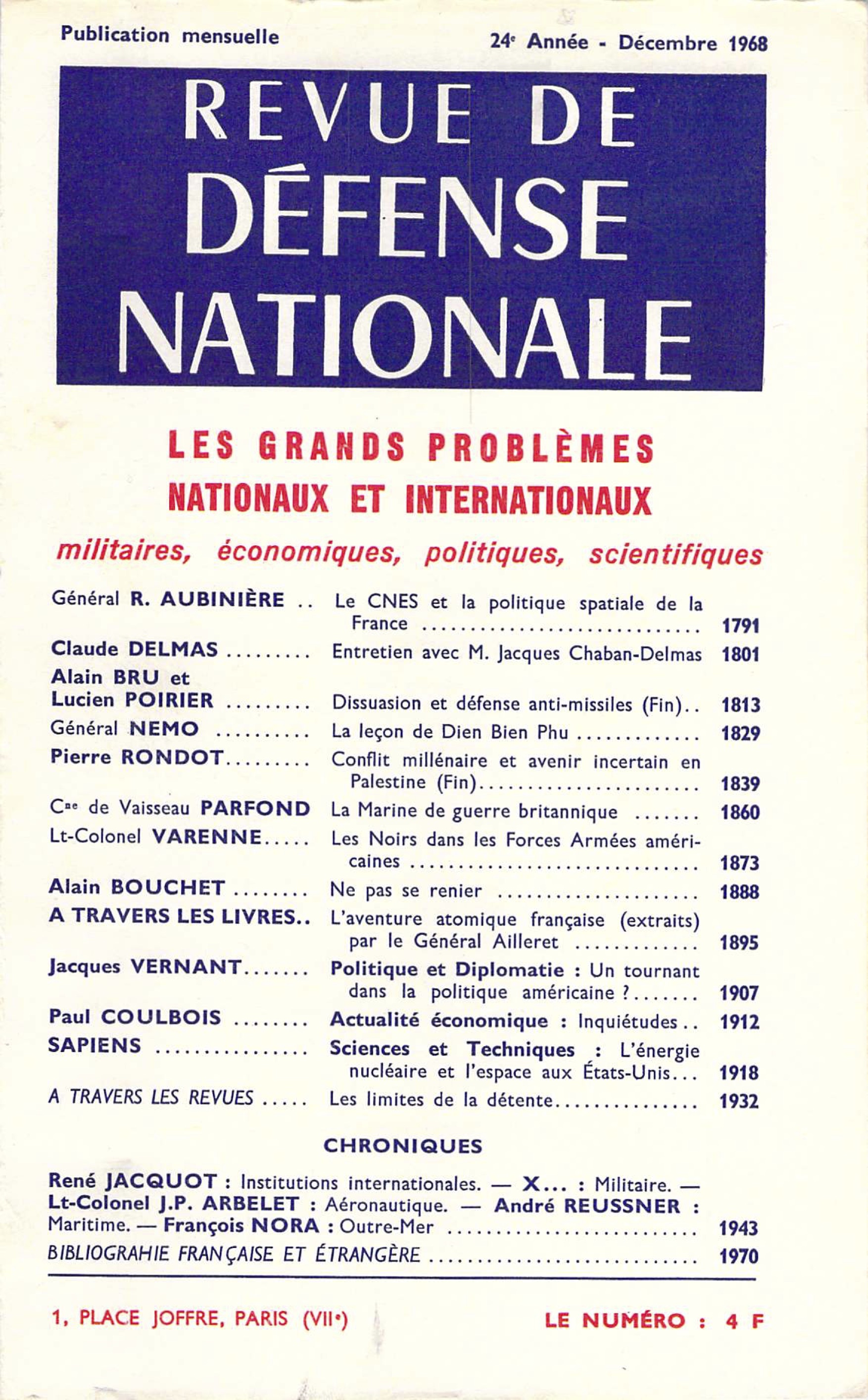 Le général Charles Ailleret est mort dans l'accident aérien du 9 mars 1968 à La Réunion. L'ancien chef d'état-major des Armées qui collabora souvent par ses articles à notre revue avait entrepris, peu de temps avant sa mort, de rassembler les souvenirs d'une carrière particulièrement variée, en un ensemble de notes et de réflexions. Le destin ne lui a pas laissé le temps de donner une forme définitive à ce travail. Néanmoins une partie de ces notes qui concerne essentiellement l'engagement nucléaire de la France, vient d'être publiée par la maison Grasset. Lire les premières lignes