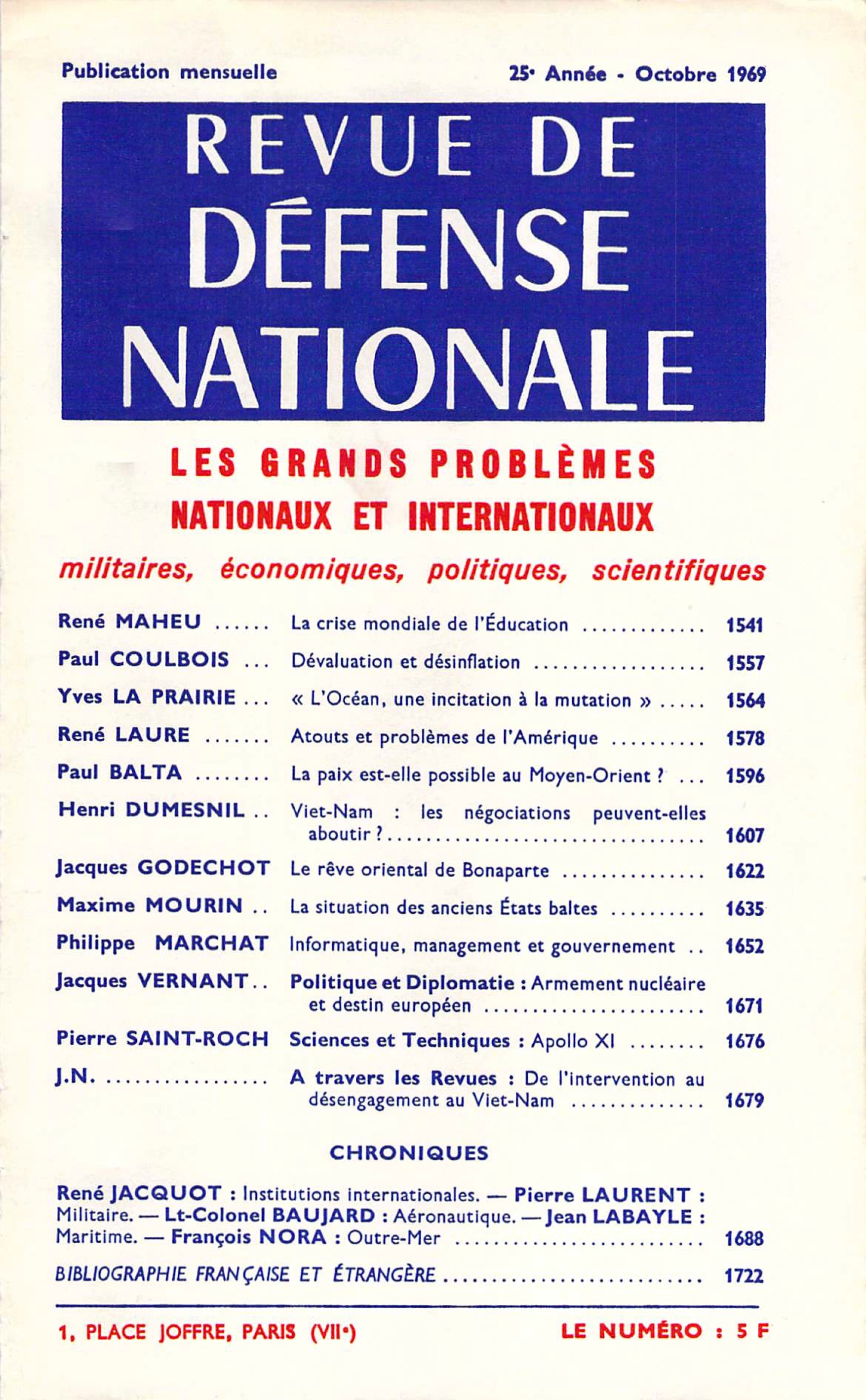 PARMI les innombrables écrits inspirés par l’intervention américaine au Viet-Nam, l’article de l’ancien Secrétaire à la Défense, Clark M. Clifford, publié dans le numéro de juillet 1969 de « Foreign Affairs », n’est certainement pas le moins significatif. Il expose l’évolution des idées d’un homme qui, depuis la fin de la Deuxième Guerre mondiale, a occupé des postes éminents près des différents Présidents des États-Unis et a eu en conséquence l’occasion de suivre attentivement, au plus haut échelon, la politique de son pays, puis d’assumer la direction des affaires militaires du 1er mars 1968 au 20 janvier 1969. Lire les premières lignes