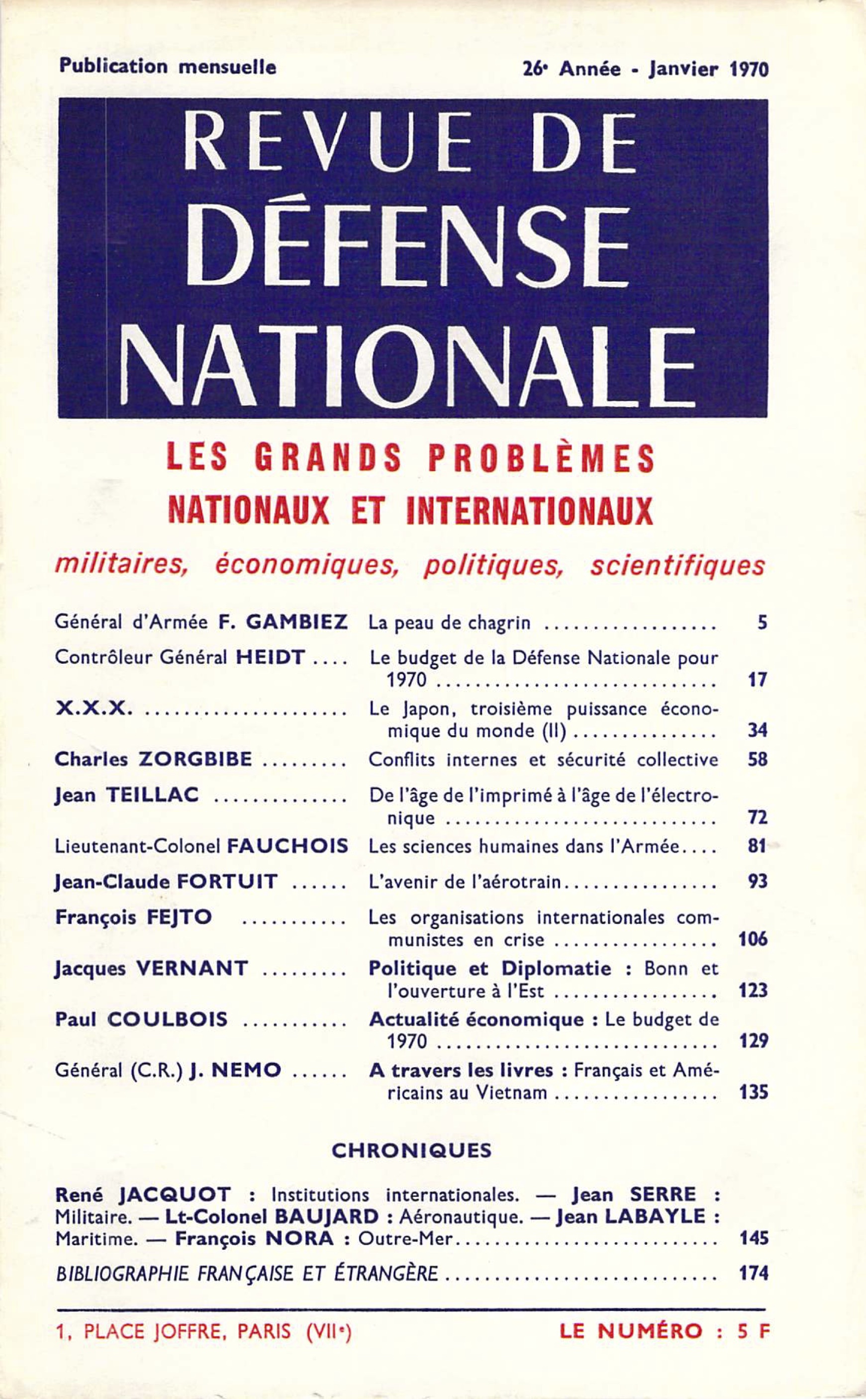 La création d’un ministère d’État chargé de la Défense Nationale n’a entraîné sur le plan budgétaire qu’un changement d’appellation. Le budget des Armées reprend en 1970 le titre de budget de la Défense Nationale, mais sans que sa structure et son contenu aient été modifiés. Il reste donc parfaitement comparable avec les budgets précédents. Le budget du Secrétariat Général de la Défense Nationale demeure au moins provisoirement rattaché au budget du Premier Ministre bien que cet organisme soit mis pour emploi à la disposition du Ministre d’État. Lire les premières lignes