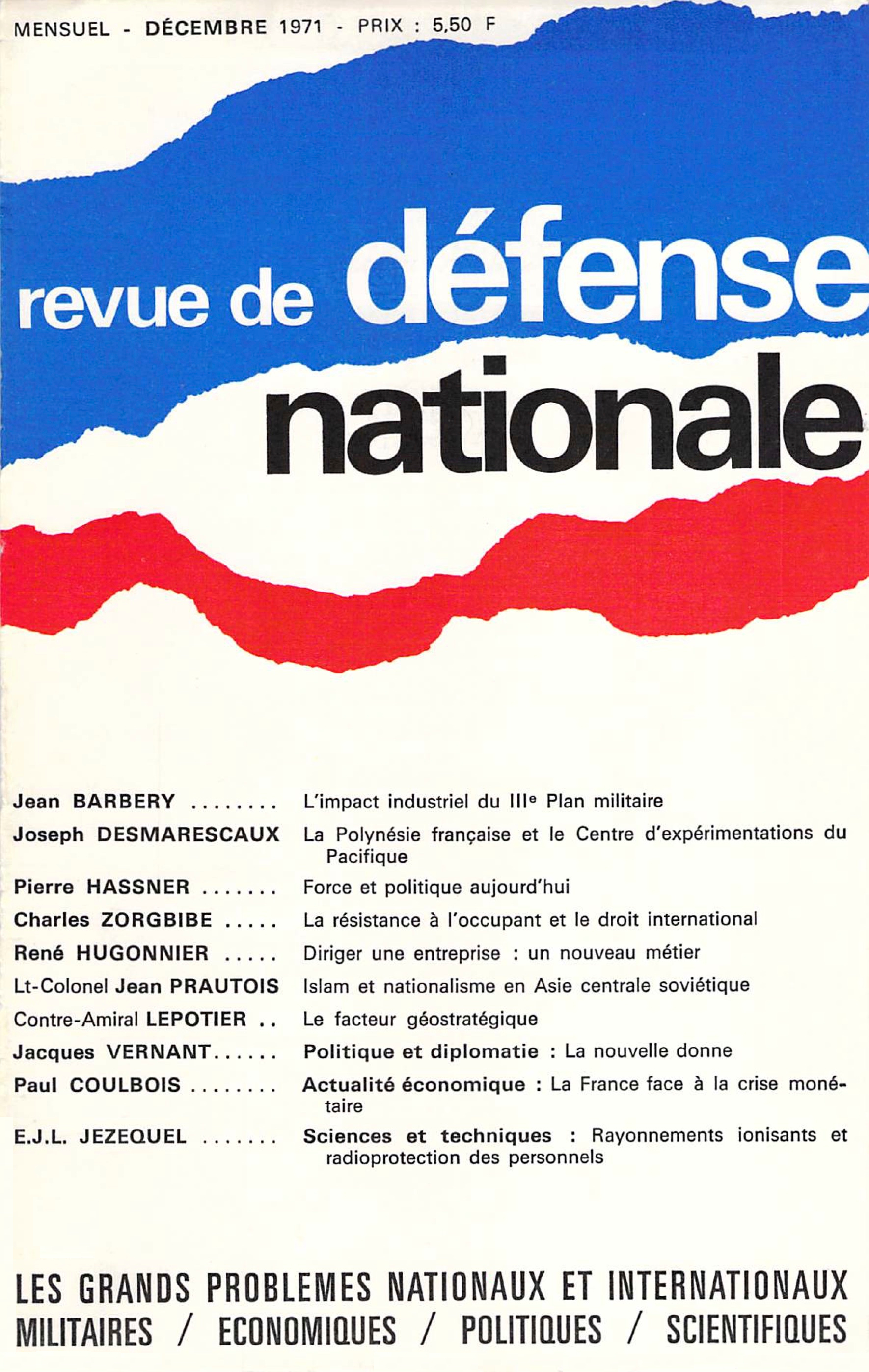Les incidences du IIIe Plan militaire (1971-1975) sur l'industrie méritaient de faire l'objet d'une étude prévisionnelle. Notre industrie d'armement qui emploie environ 270 000 personnes intéresse des secteurs de pointe particulièrement sensibles et importants pour l'ensemble de notre économie. Elle est en outre très localisée dans des régions souvent sous-industrialisées. Il convenait donc de chercher à prévoir quel impact le IIIe Plan militaire allait avoir sur le plan industriel. L'auteur expose ici la méthode adoptée et les résultats essentiels tels qu'ils ressortent de l'étude menée pour répondre à cet objectif. Lire les premières lignes