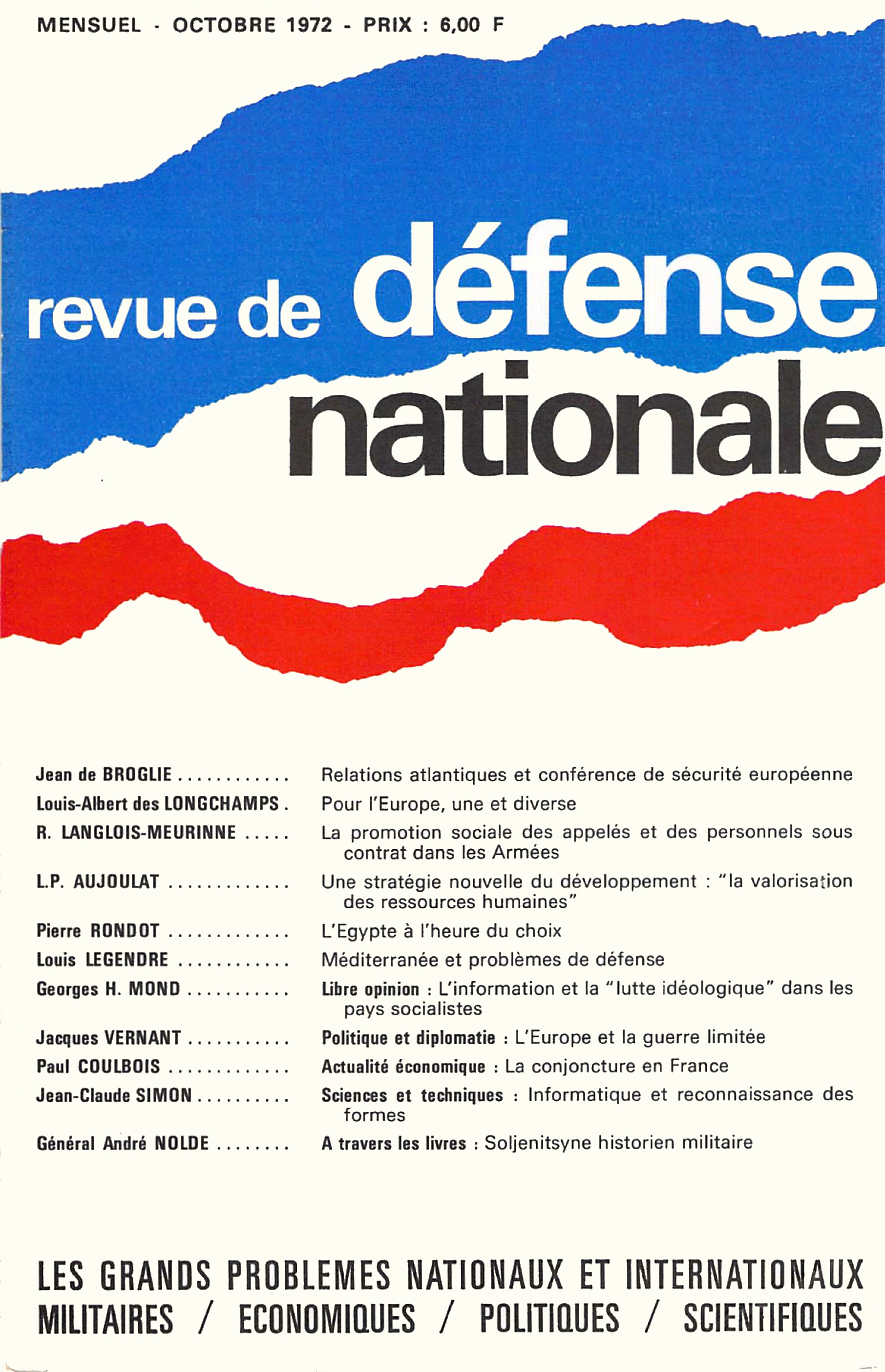 À l’heure où les Grands garantissent l’intégrité de leurs sanctuaires par des accords bilatéraux sur la limitation et l’emploi de leurs armes, l’Europe occidentale pourrait devenir le champ clos privilégié de leurs affrontements. Il est donc urgent qu’elle se donne les moyens et la stratégie d’une défense globale qui lui soit propre. Il était utile que dans cette perspective l’on nous rappelât en termes précis et brefs, l’histoire, les structures, le rôle et les problèmes des systèmes de défense en place. Déclarations, textes de traités, conclusions de rapports, messages officiels, organigrammes et tableaux viennent illustrer l’excellente étude que nous propose Martine Meusy dans la collection des « Dossiers Themis ». ♦